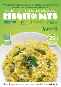 Il weekend del 27, 28 febbraio e 1° marzo 2026 si terrà in provincia di Vercelli la terza edizione dei “Risotto Days”, manifestazione organizzata da Fipe-Ascom nell’ambito della “Settimana del Riso”, insieme di eventi ed iniziative promosse da Confagricoltura Vercelli e Biella e da ANGA Vercelli, con il supporto di diversi Enti ed Istituzioni territoriali.